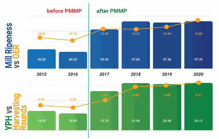 การนำโครงการ PMMP มาใช้ได้สร้างผลลัพธ์ที่จับต้องได้ในหลายด้านของการดำเนินงาน แปลงปลูกมีการปรับปรุงอย่างเห็นได้ชัดในอัตราการสกัดน้ำมัน (OER), ระดับความสุกของผลปาล์มที่เก็บเกี่ยว, ผลผลิตต่อเฮกตาร์ (YPH) และจำนวนรอบการเก็บเกี่ยวเรียงหัวข้อ “Impact Summary” หรือ “Key Outcomes” ต่อเลยไหมครับ?